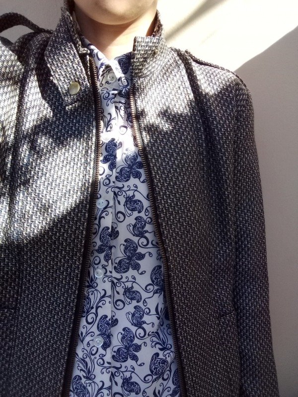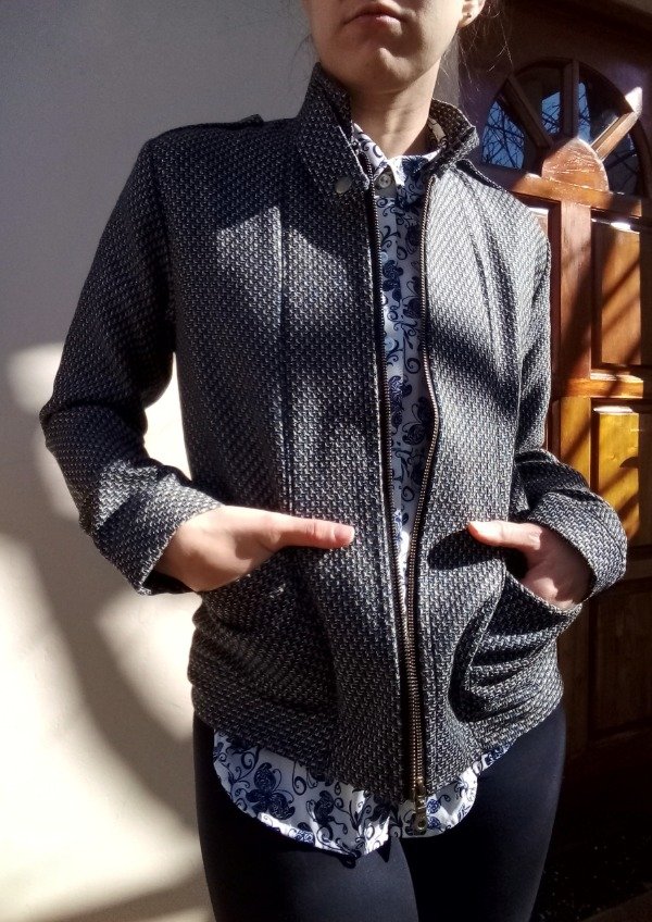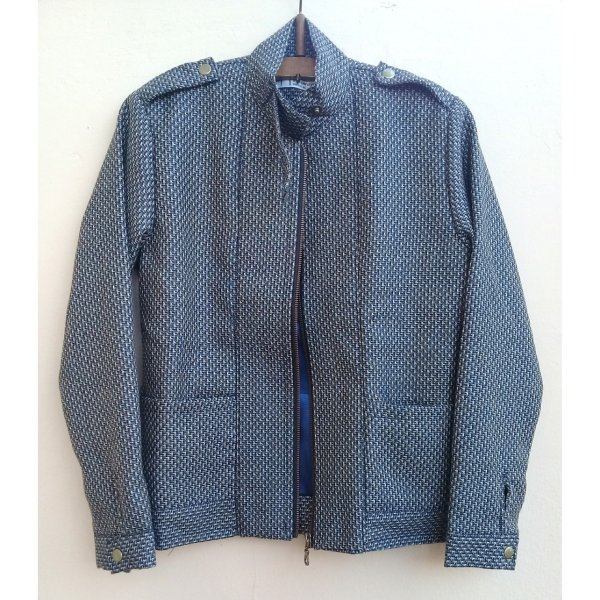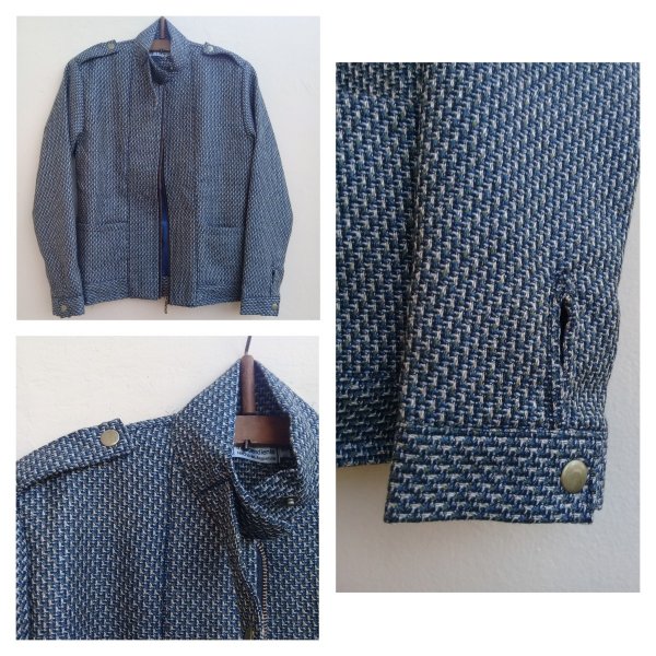 Chaqueta entallada en tejido de algodón, forrada en satén, costuras interiores reforzadas. Delantero con cierre. Cuello, y puños con botones snap de bronce (broches a presión). Bolsillos en el frente. Entallada a la cintura. Diseño independiente. Hecho a mano 🇦🇷.