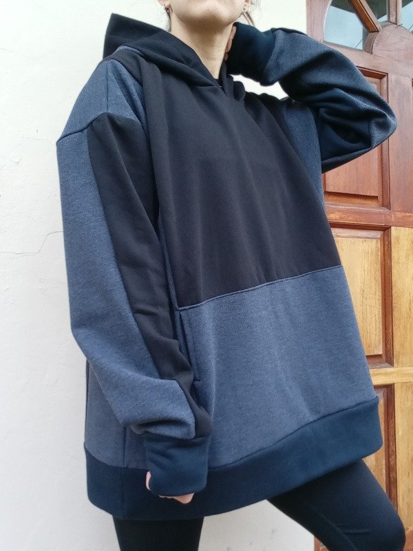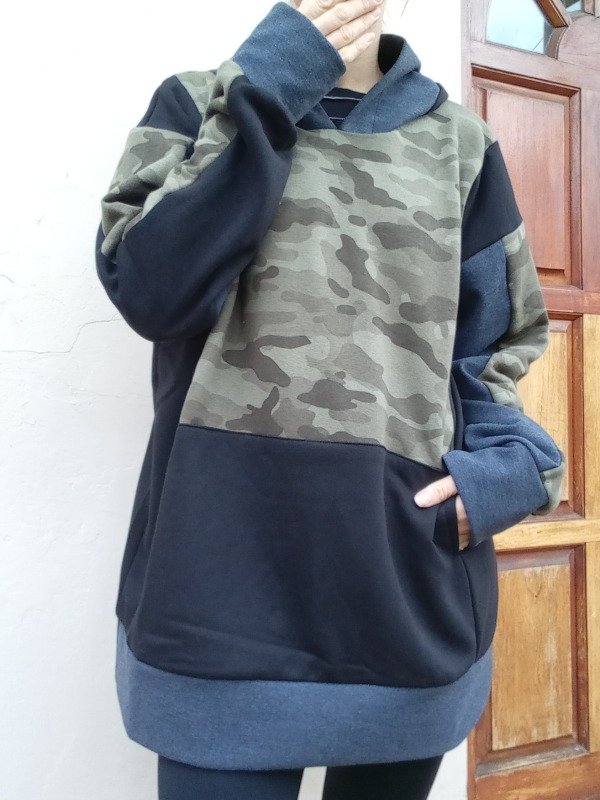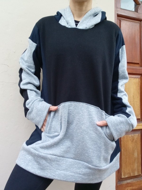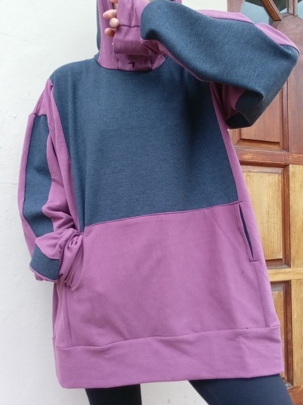 Maxibuzo de frisa de algodón con recortes . Amplio y largo. Bolsillo super grande. Capucha.