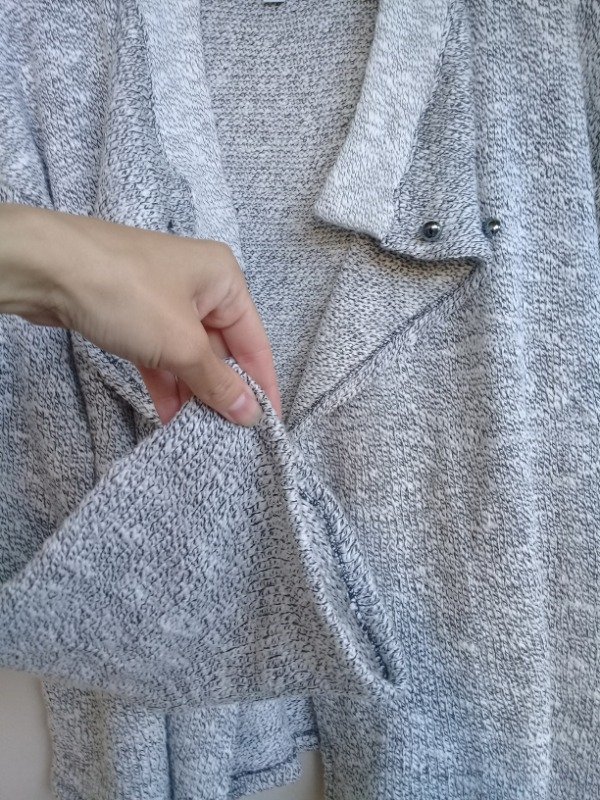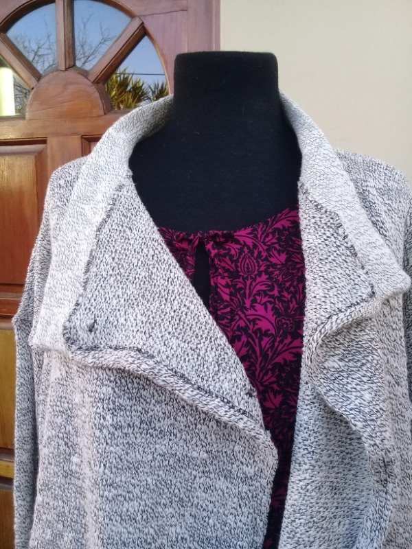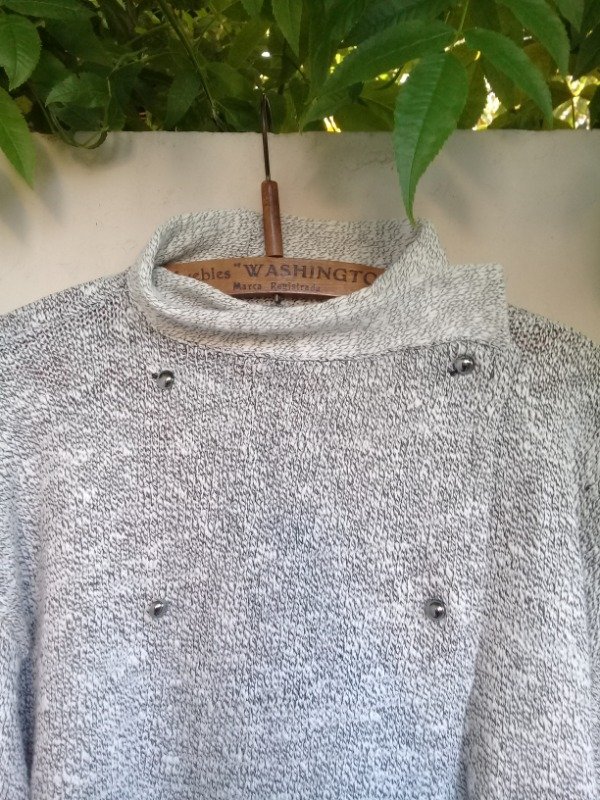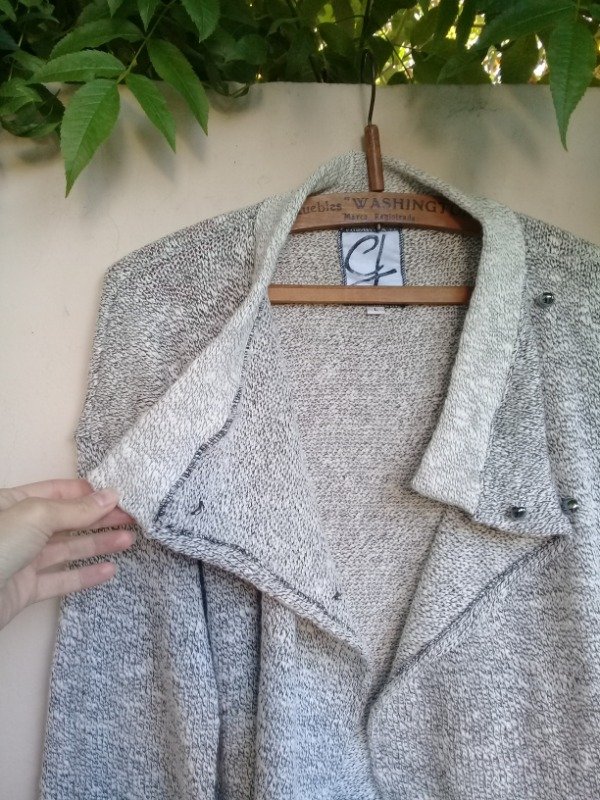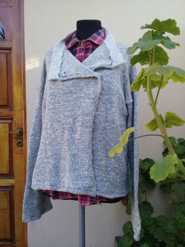 Sacón de lanilla tejido grueso. Hombros anchos, y mangas caídas, anchas y rectas. Abertura cruzada, con 4 botones y ojal. Cuello combinado con lanilla mas clara. Corte amplio. Súper suave .