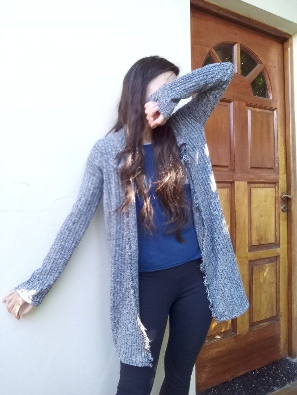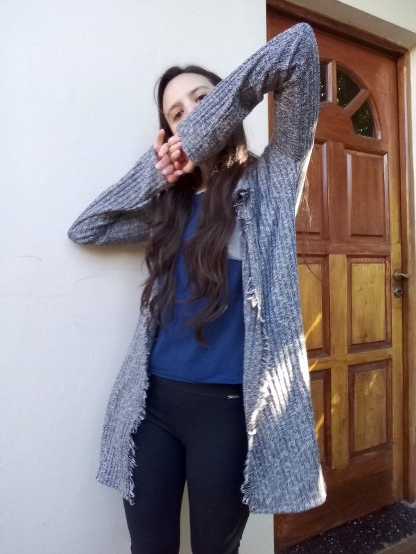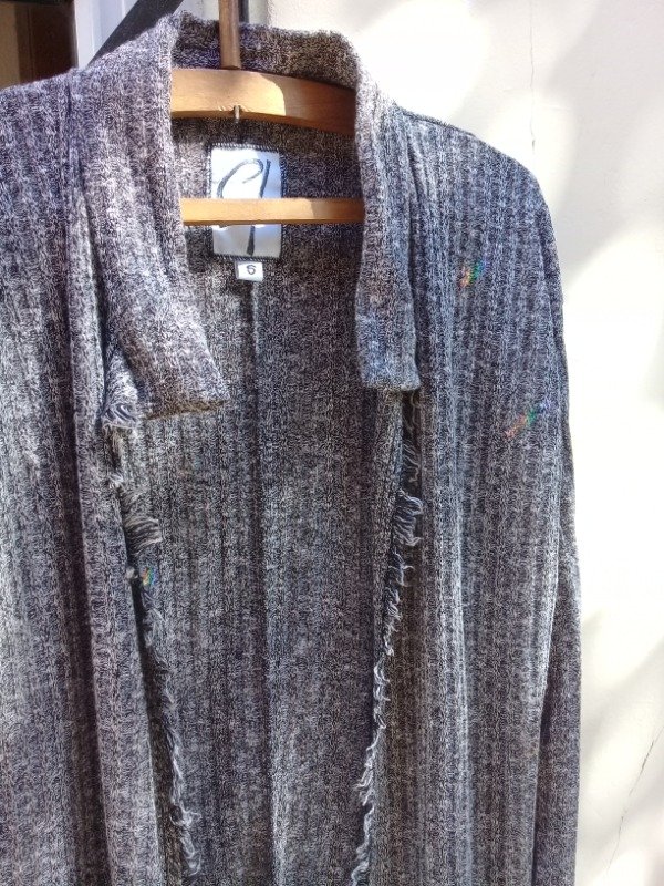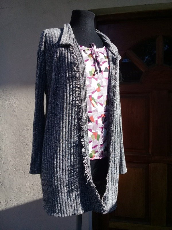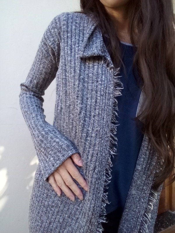 Saco largo de lanilla jaspeada gris. Tejido elástico. Queda abierto. Los bordes del frente tienen flequitos.