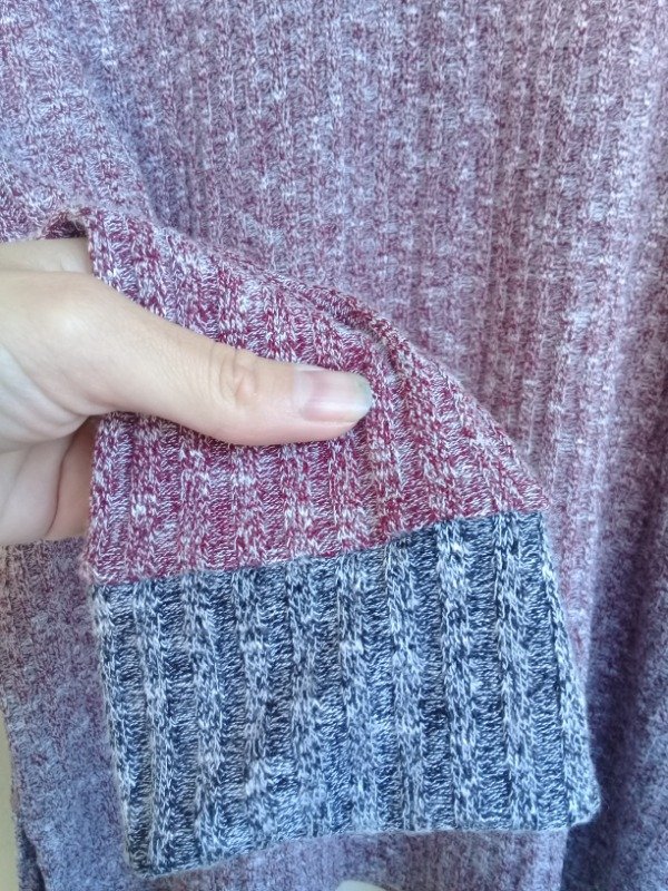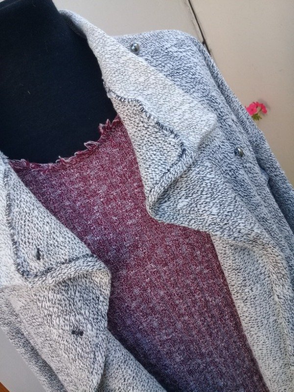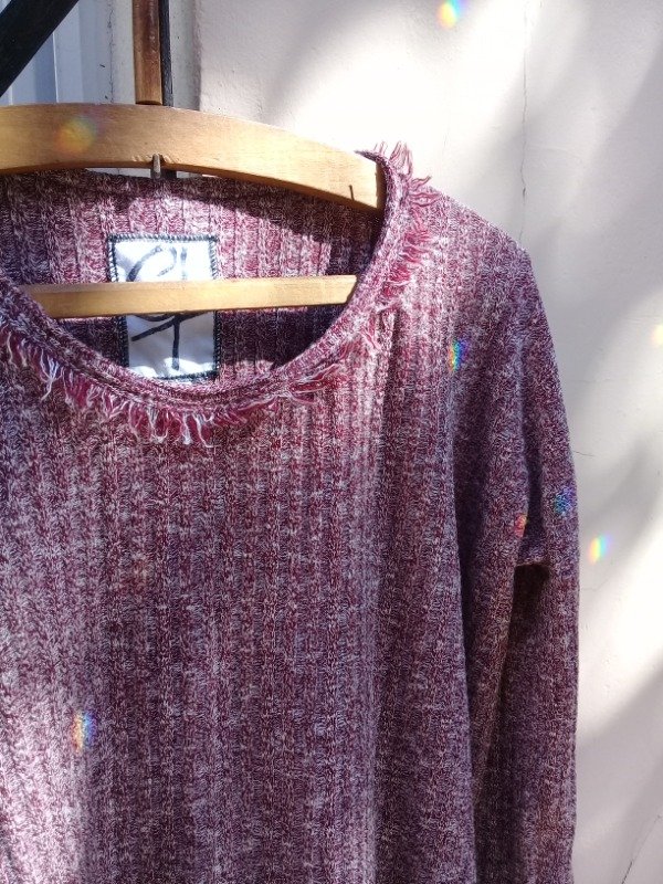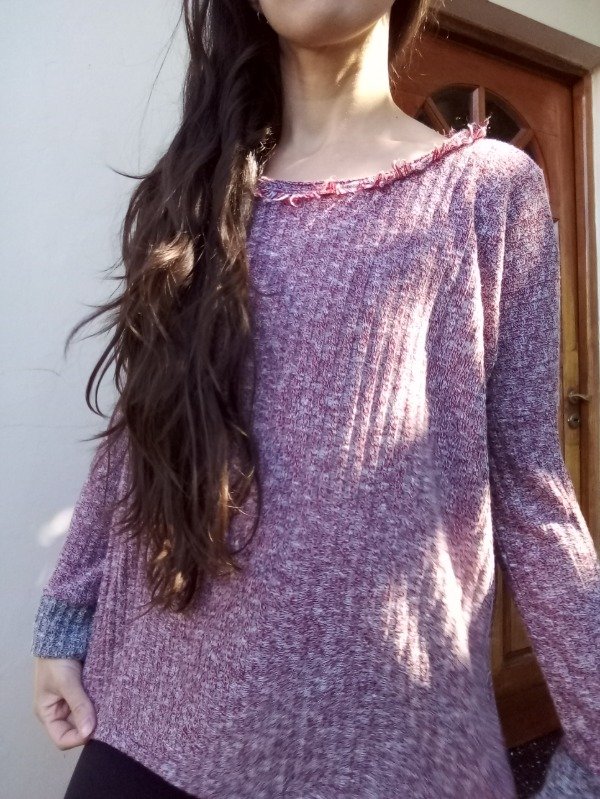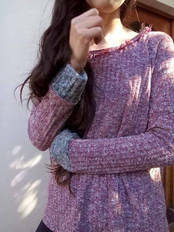 Swéter de lanilla jaspeada bordó con puños grises. Hombros anchos, y mangas caídas. Cuello redondo con flequitos. Tajo de 10 cm en los laterales. Corte amplio.